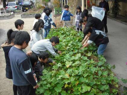 2年生が生活科で育てていたサツマイモを掘りました。最初は小さいおいもが出てきて,ちょっとがっかり気味だったのですが,掘っていくと大きなおいもが出てきました。みんな大喜びです。このサツマイモは,1年生を招待して行うフェスティバルでおいしくいただく予定です。