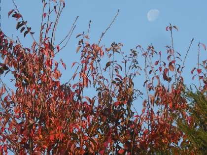 登校指導中にふと空を見上げると,校門の朝日に輝く桜の紅葉と間もなく下弦を迎える月が青空に美しくマッチしていたので写真を撮ってみました。周期のある月と,紅葉,青空がいっしょに見られるのいいですね。