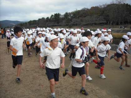 師走らしい肌寒さの中,賀茂川の北山橋〜北大路橋間の周回コースで「かもがわマラソン」を実施しました。午前9時40分,高学年のスタートです。10分おきに,中学年・低学年とスタートしていきました。高学年は1時間,中学年は50分間,低学年は40分間走り続けます。自分の目標としている記録への挑戦です。