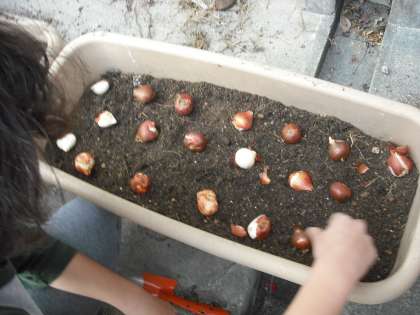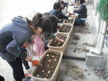 委員会活動でチューリップの球根をプランターに植えました。来年の春,新1年生が入学するころには,チューリップの花でいっぱいになることでしょう。もちろん,花壇にも植えます。