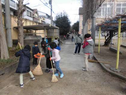 正門から玄関前,渡り廊下,体育館周り,体育倉庫,更衣室,グリーンベルト,中庭,その他様々な場所をみんなで掃除しました。まだ残っていた落ち葉も,大量に集められきれいになりました。