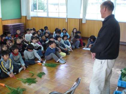 今日の5,6校時に,2年生の時からお世話になっている野菜博士の土橋先生に野菜作りや農業についてお話を伺いました。その後,子どもたちから質問を受けてくださいました。一つ一つの質問に対して丁寧に答えていただきました。最後には今朝一番で土橋農園で収穫された野菜をたくさんいただきました。ありがとうございました。3年生全員で分けて持って帰りました。