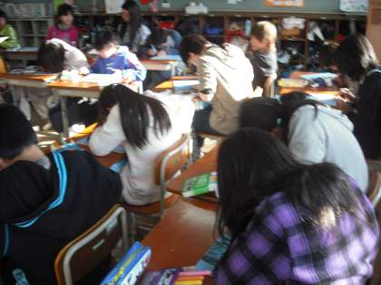 いよいよ彫りはじめました。丸刀,三角刀,平刀,切出しなどの彫刻刀を使って丁寧に彫っています。彫刻刀を正しく使って,怪我のないようにしましょう。