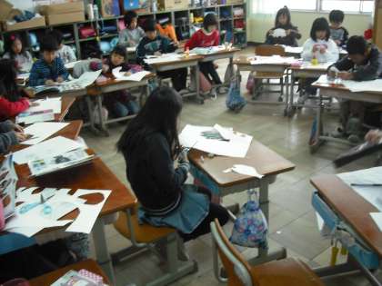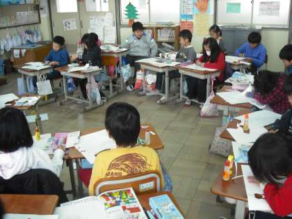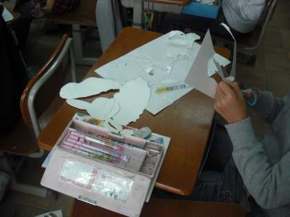 2年生も版画が始まっています。画用紙を手で破いたり,はさみで切ったりしてできた形で版をつくります。