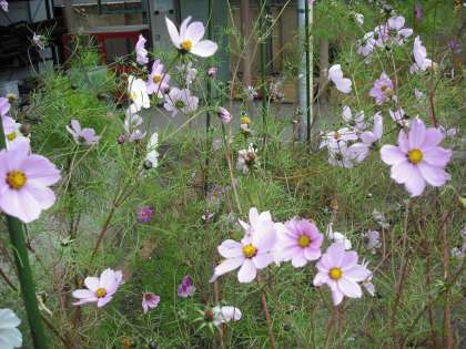 花壇の水仙もいつのまにかつぼみをつけています。その横では,まだコスモスが咲いています。