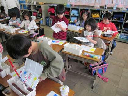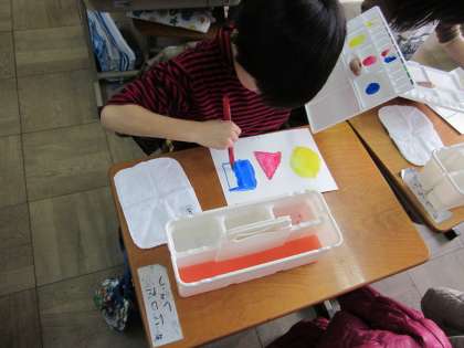 1年生が初めて絵具を使います。ドキドキしながらチューブからパレットに絵の具を出し,絵筆を使って○や△,□に色を塗りました。これから練習して,絵筆を上手に使えるようにしましょう。