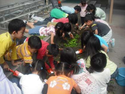 教室で芽をだした,夏に咲く花の苗を花壇に植えるために,花壇の準備をしています。雑草を抜いて,肥料をやりました。土も柔らかくほぐして準備ができました。明日には植えられるかな?