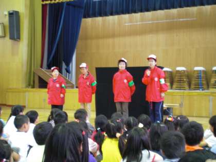 3校時に,北警察署・北平安レディースの皆さんのご協力で防犯教室が開かれました。ペープサートやクイズなどをしていただいて,どうやって犯罪から自分の身を守るのかを見せてもらい,もしもの時に「助けて〜!」と大声を出す練習もしました。