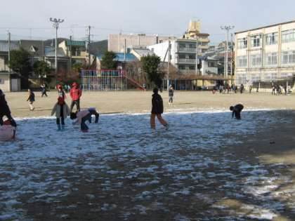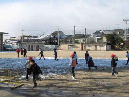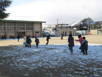 朝のうち,一面真っ白だった運動場も日陰のところだけ雪が残っています。少しだけ残った雪で雪合戦です。二週間ぶりに,元気な子どもたちの姿が運動場にも戻ってきました。