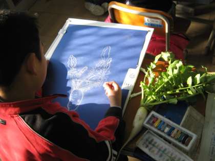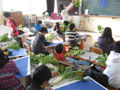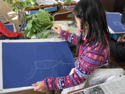 先ほど収穫したばかりのダイコンをよく観察して,絵にかきました。葉のつき方・形・根の部分のしわなど,よく見てかきました。