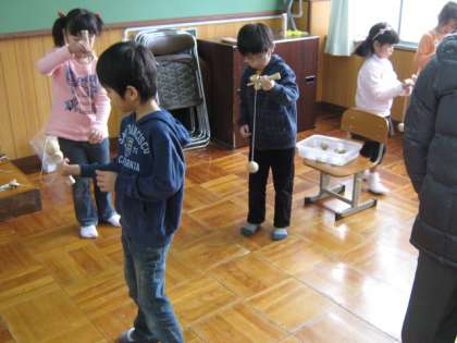 生活科で,冬の遊びをいろいろ楽しみました。今日は自由参観なので,保護者の皆さんにも教えてもらいました。こま回し(写真上)とけん玉(写真下)です。