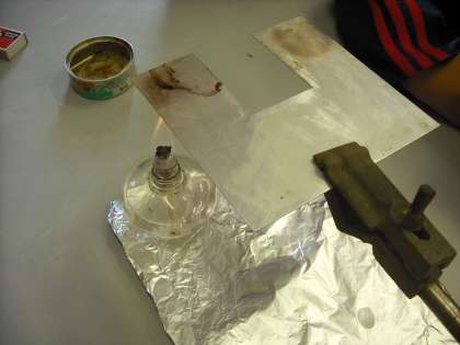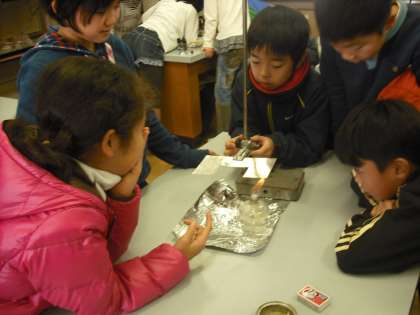金属がどのようにして熱を伝えるか,予想をして実験で確かめています。金属板にロウをぬって,溶けていく様子で調べています。凹の形をした金属板と□の形をした金属板では熱の伝わり方が違うようですね。