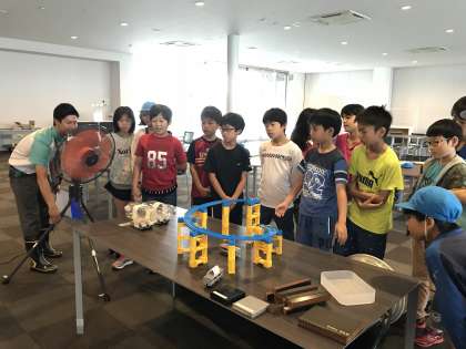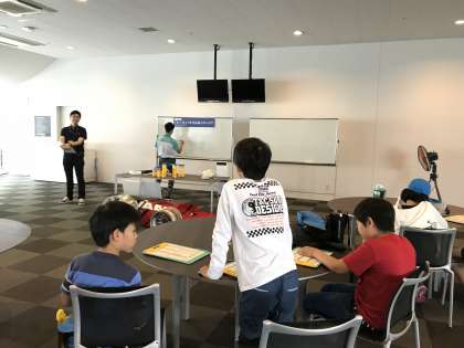 鈴鹿サーキットで、モータースポーツ体験の学習をしています。実験を交えた学習で子どもたちは興味津々です。