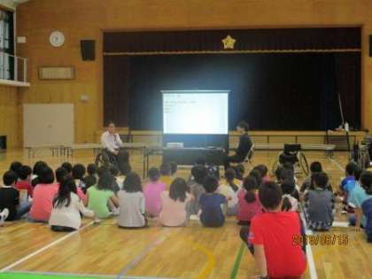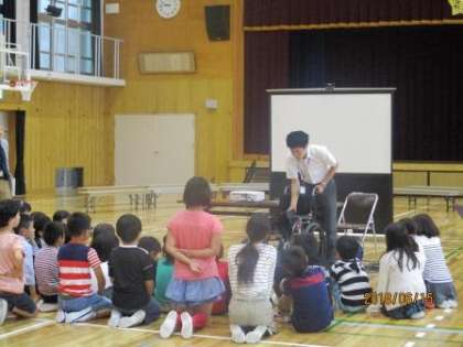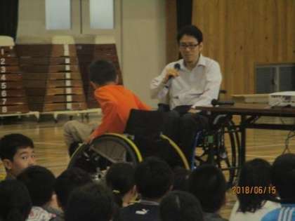 車いすバスケットボールをされているということで,競技用の車いすも持ってきてくださり,各クラス代表1名ずつ乗らせてもらい感想を発表しました。