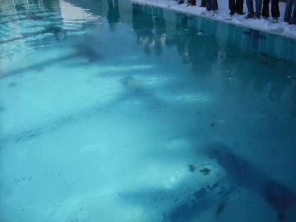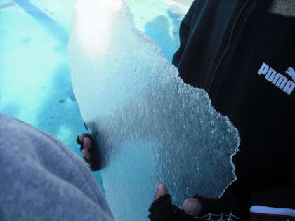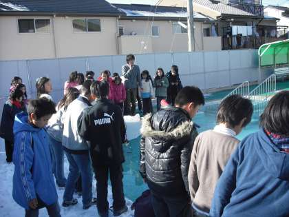 週末からの寒波でプールや観察池も凍っていました。そこで,「変身する水を調べよう」の学習に興味を持たせるため,実際の様子を観察しました。これから,水から氷,氷から水への状態変化は季節や昼夜による温度変化や日なた・日かげの温度の違いに関係していることを学習していきます。