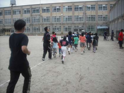 今日はおやじの会主催の「キャッチボール大会」です。28名のお友だちが参加しています。待鳳ドラゴンズの選手たちや保護者の方が手伝ってくれています。おやじの会のメンバーも一緒にランニングです。