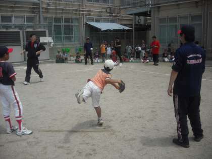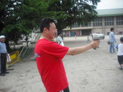 今度は,今年初登場の「スピードガン」を使って球速を測ります。松坂選手やダルヒッシュ選手のように,速く投げられるかな?