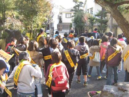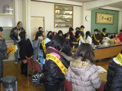 会議室に集合し,たすきをもらい,それぞれのお店に向かって出発です。10時から販売スタートですが,それまでの準備もお手伝いします。お昼までの短い時間ですが,がんばって働いてほしいと思います。