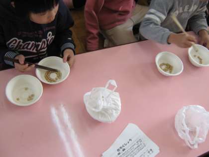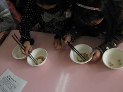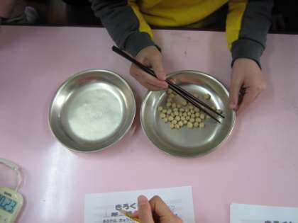 今週は給食週間です。給食委員会主催の「豆つまみチャレンジ」が行われました。今日は1・2・3年生です。お箸でつまんでも,ツルツルと豆が逃げてしまいます。みんな悪戦苦闘しながらがんばっていました。