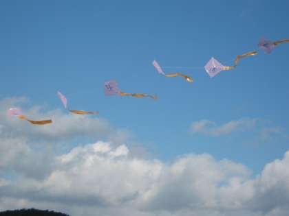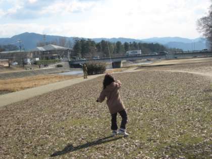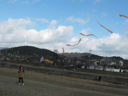 先日作った凧を,今日は賀茂川の河川敷であげました。風があったので,うまくあがりました。連凧もきれいにあがっています。連凧の糸が切れるハプニングもありましたが,楽しい凧あげでした。