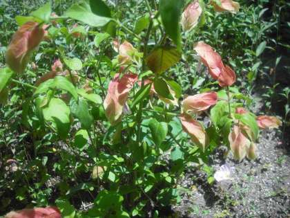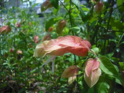 おもしろい咲き方の花を見つけました。常緑の多年草で,その花の型,色から「コエビソウ」とも呼ばれます。草丈は1m以上にもなります。赤く,ゆでられたエビみたいに見える花は葉を包むがくが変化したもので,花の本体はその先からでている白い部分です。この白い部分は短命ですが,赤い花の部分は長期間鑑賞できます。職員室前の植込みにあります。