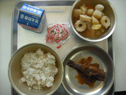 今日の給食は節分の行事献立です。いわしのしょうが煮と福豆がついています。おいしくいただきましょう。もしかしたら,夕食がいわしというお家もあるかもしれませんね。