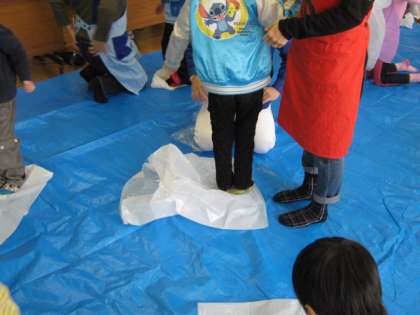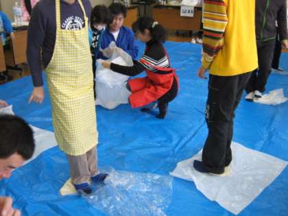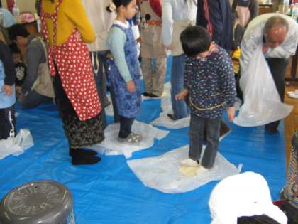 大きな袋に生地を移し替え,足で踏んでいきます。うどんの「こし」を出す大事な作業です。伸ばしてはまるめ,また伸ばしと何回も繰り返します。この後,ストーブの周りで30分間生地をねかします。