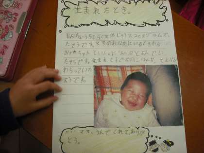 小さい頃のことについて家族や周りの身近な人々に聞いたり,思い出の品物を集めたりして,「わたしのものがたり」をつくります。