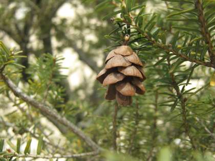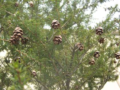 マツ科の常緑針葉樹です。先のほうに小さなまつぼっくりがついています。6月から7月ごろ花を開き,秋には小さな球果をつけます。今はそれが開いています。