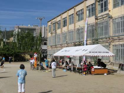 午前9時の入場行進のあと,開会式,開会宣言,児童会スローガン,全校ダンスが行われました。