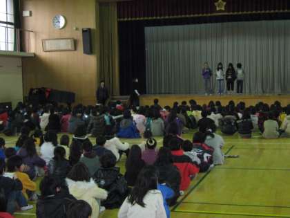 今日の児童集会では,全校合唱の「世界が一つになるまで」を歌ったあと,計画委員の6年間の思い出の発表がありました。あと一ヶ月で卒業を迎える6年生。今までの小学校生活を振り返り,心に残る思い出をみんなの前で発表しました。