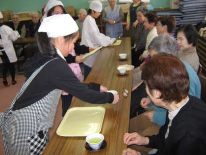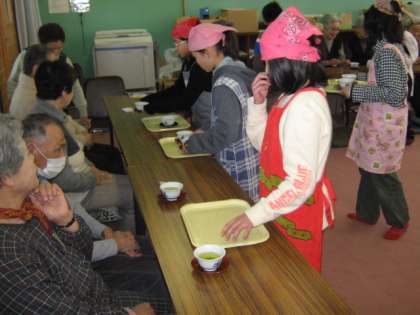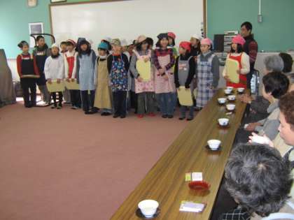 今日は5年3組がすこやか学級と交流しました。家庭科で学習したお茶の入れ方を生かして,おいしいお茶をお出ししました。みんな緊張気味です。「世界が一つになるまで」の歌も聞いていただきました。