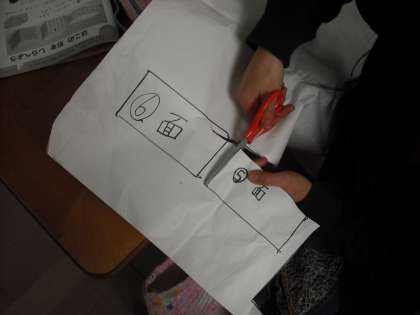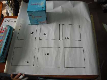 箱の形を構成する要素(面・辺・頂点)に着目して,箱の形の特徴的な性質について考えられるようにする学習です。箱の面を画用紙に写し取り,箱の面の形や数について調べています。