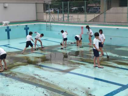 今日の午前中に毎年恒例5年生のプール掃除がありました。あいにくのお天気でしたが,子どもたちは元気一杯!最初は真っ黒い水でしたが,だんだん だんだんきれいになっていきました。頑張ってプールの壁面も磨くこともできました。5年生ご苦労様!