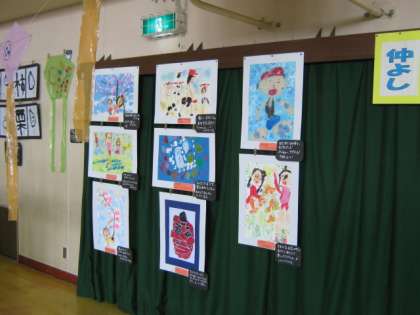 仲よし学級は,「仲よし美術館」と題してこの1年間に取り組んだ作品を展示しています。絵や工作だけでなく,習字や連だこなど,多彩な作品が並んでいます。