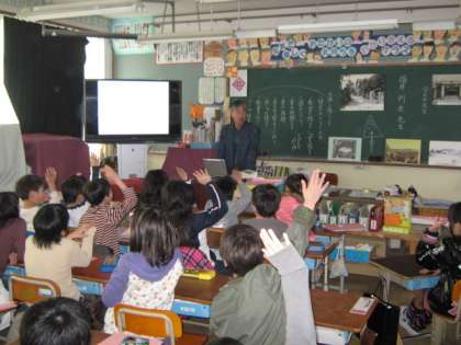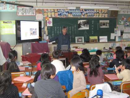 3年生では,社会の学習で昔の様子を調べていますが,今日は児童のおじいさんがゲストティーチャーとして,お話をしてくださいました。こま回しや竹馬など,今とは違う遊びの様子に子どもたちも興味深く聞いていました。たくさんの絵や写真を見せていただきながら,わかりやすくお話してくださいました。ありがとうございました。