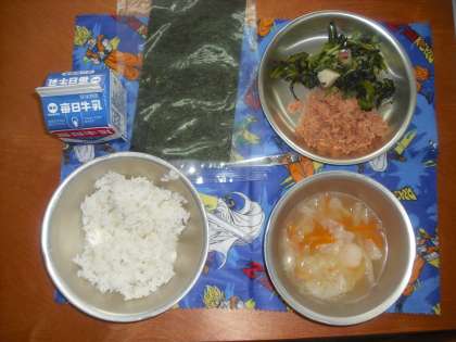 今日の給食は「セルフおにぎり」です。メニューはむぎごはん・てまきのり・セルフおにぎりのぐ(うめさけ)・かまぼこと小松菜のいためもの・キャベツの吉野汁・牛乳です。「かまぼこと小松菜のいためもの」は新献立です。これは,さとう・しょうゆにからしをきかせた味つけになっています。今日も残さず,おいしく食べましょう。