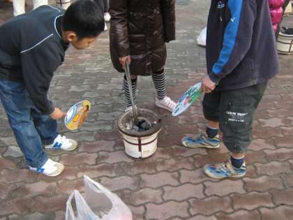 社会科で昔の道具について学習しましたが,今日は実際に七輪を使ってお餅を焼きました。お餅は,昨日の卒業祝い餅つきでいただいたお餅です。七輪に火をおこすところからなかなか大変でしたが,今日は地域の皆さんがお手伝いに来ていただいているので,炭に火をつけることができました。