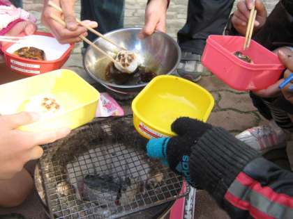 七輪の上にお餅を並べて焼いていきます。炭火は炎が上がっていなくても火力が強いので,お餅が焦げやすかったですが,おいしそうに焼きあがりました。砂糖醤油をつけていただきました。