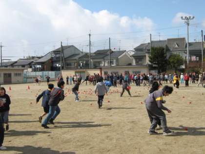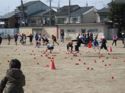 4年生とは玉入れで対戦です。4年生はトラックより内側から,6年生は外側から玉を投げます。中にいる受け手の方は4年生が3人,6年生が2人です。いつもの玉入れより投げる距離が遠くなり,なかなか玉が入りません。結果は4年生が44個入れて勝ちました。「6年生にチャレンジ」も,いよいよ次は5年生とのドッジボール対決です。