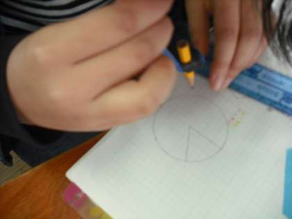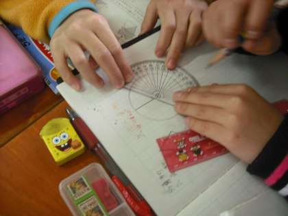 正六角形の性質を利用して,コンパスや分度器を使って作図しています。コンパスを利用するといろいろな楽しい図形がかけるね。