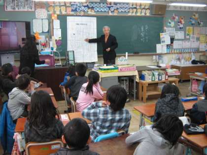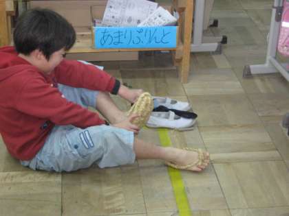 今日は,校区に昔からお住まいの上野さんにお話をうかがいました。待鳳小学校はできたときは「東紫竹小学校」といったことや,学校への道が両側が藪の細い道だったこと,校区が今の5倍くらいあったことなど,子どもたちには初めてのお話ばかりでした。100年ほど前は,みんな「わらじ」をはいて登校していたということで,「わらじ」も持参してきていただきました。子どもたちもはかせてもらいました。貴重なお話をどうもありがとうございました。
