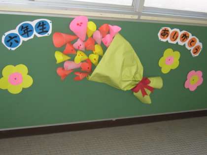 昨日,「6年生を送る会」が終わり,6年生にとっては小学校生活も本当に残り少なくなってきました。廊下や階段踊り場の掲示板も,卒業モードにかわってきました。それぞれの学年が,心をこめた掲示をしています。