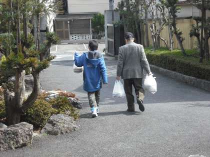 今日も子どもたちのボランティアがお手伝いして,お年寄りの皆さんのお家にお弁当を届けます。