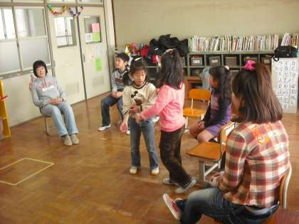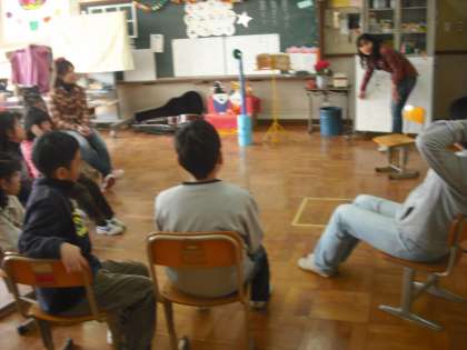 今日は大宮小学校のお友だちをお迎えして,交流会を持っています。自己紹介の後,いす取りゲームやなぞなぞなどの遊びを通して,楽しい交流をしています。