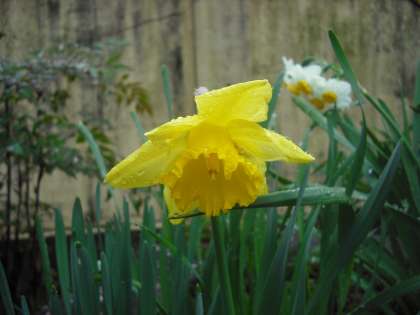 雨の中,ようやくラッパ水仙が咲きました。例年よりも10日ほど遅くなっています。