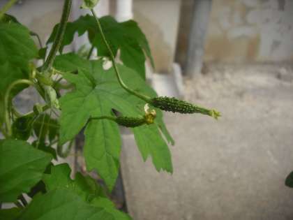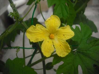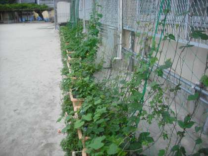 「緑のカーテン」のゴーヤにかわいい実ができています。黄色い雄花も咲いています。今年の「緑のカーテン」は,今までと違って勢いがあります。どうか,うまくカーテンになりますように。