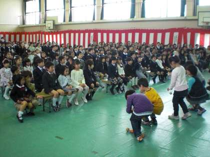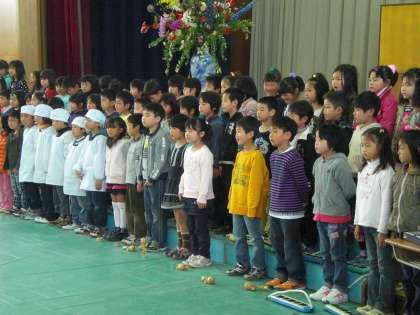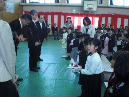 地域の諸団体のみなさんから,入学祝いの品をいただきました。安全傘・安全ワッペン・交通安全消しゴム・防犯ブザー・ファイルです。一年生のみなさん大切に使いましょう。最後に二年生によるお迎えの言葉がありました。