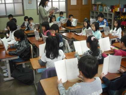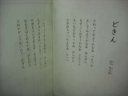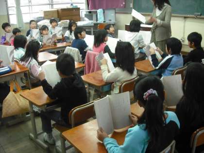 「どきん」という詩を,姿勢,言葉の抑揚や強調,間の取り方,文末の違いなどに注意して読んでいます。みんな上手だよ。