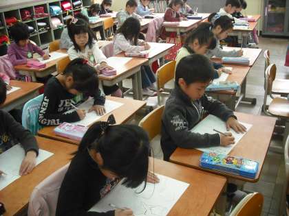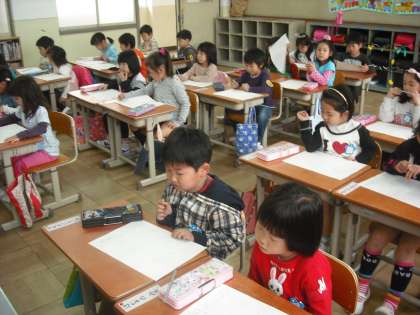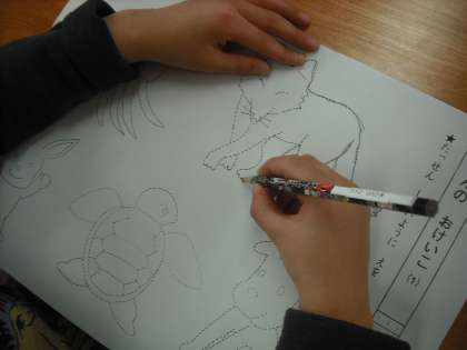 鉛筆の正しい持ち方を学習して,点線で書かれた動物をはみ出さないように書いています。正しく鉛筆を持っていないとはみ出してしまいます。みんな慎重に真剣に書いています。